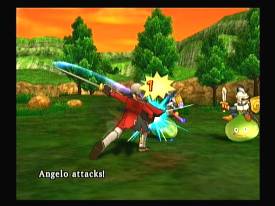 Бои - традиционно-пошаговые. За убитых монстров получаем опыт и профессионально растем в характеристиках и умениях. Первое нашего участия почти не требует, разве что съеденные специальные семена увеличат на один-два балла атаку/ защиту/ ловкость/ мудрость/ количество здоровья и магической энергии. Очки умений можно разбросать по предпочитаемым видам оружия (топоры, дубины, молоты, мечи, хлысты, бумеранги, кинжалы) и одному уникальному навыку (привлекательность и харизма у Jessic'и и Angelo, гуманизм Yangus'а и храбрость главного героя). Обучение выводит персонажа на новый уровень владения предметом, усиление наносимых повреждений, положительное отношение монстров к героям, появление в арсенале специальных атак с дополнительным эффектом. Заклинания всплывают в памяти персонажей сами собой, по достижению определенного уровня. Стандартен набор школ магии (огонь, вода, земля, воздух) и спецэффекты от применения. На поле боя можно вызвать небольшое подкрепление в виде мышонка Манчи, привлеченного куском сыра из заплечного мешка. Грызун может кого-нибудь укусить или подлечить раненного. Монстры разбросаны по 13 семействам и имеют свою специализацию. Среди «родственников» есть свои бойцы, маги, лекари, служба поддержки, командиры и элитные войска, за исключением крутого клана боссов, которые прекрасно сочетают все перечисленное в своих скромных персонах. Нашей смерти жаждут все эти плюшевые и безобидные на вид кошки-собаки-волки (Beast); пчелки-бабочки-кузнечики (Bug); птички-невелички (Bird); все прямоходящее о двух ногах и отдаленно напоминающее людей (Humanoid); лютики-цветочки (Plant); капельки и лужицы (Slime); простейшие элементарные частички природы (Elemental); давно умершие скелеты-зомби-мумии (Zombie); сундучки-скамейки и другие предметы быта (Material); механические творения жителей мира (Machine); орда демонов (Demon) и целый выводок драконов (Dragon). Сражения с этим списком - занятие для терпеливых и упорных. Остальные обрызгают команду «святой водой», перепрыгнут обратно к городку, уклонятся от битвы в надежде быстрее приникнуть к источнику сюжета, наплевав на крупицы опыта и золота. И будут жестоко наказаны радостным от визита слабаков сюжетным боссом.