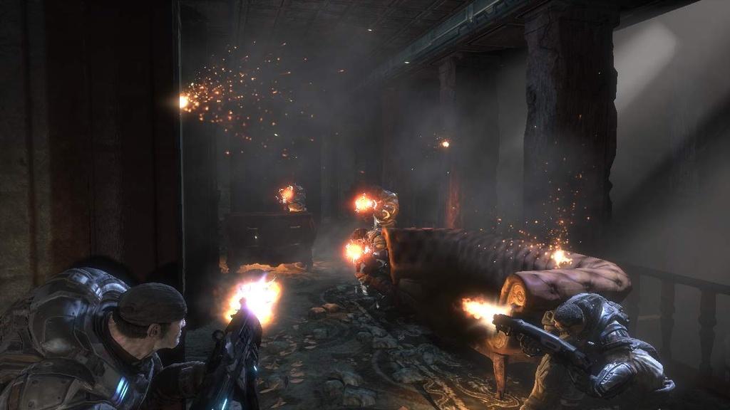 Кнопка «А» в игре используется чаще всего. Помимо того, чтобы бегать и прижиматься, она ответственна за взаимодействие с укрытиями. Скорректировав направление при помощи левого «стика», можно быстро переметнуться от одной колонны до другой, перелезть через бетонный блок или резко отпрыгнуть от подбежавшего монстра. Просто, как и все гениальное. Война из-за укрытий сконцентрирована не только на том, чтобы высунуться и выстрелить. Помимо этого, есть возможность вести огонь неприцельно, вслепую, выставив руку с автоматом. Очень помогает, когда враг бежит напролом, а здоровье на пределе. Оружие в игре можно обозначить одним ёмким прилагательным - сочное. Настоящие Большие Пушки для крутых парней. Револьвер по размеру сравнится с дробовиком из иных шутеров. Дробовик - с ракетницей. Ракетница - с мобильным зенитным комплексом. Бухает и ухает все это добро соответсвенно. Шипастые гранаты болтаются на длинных цепах, и Маркус их основательно раскручивает перед броском. Дополнительно есть пара автоматов, пистолет и снайперская винтовка. Из экзотики присутствует энерголук со взрывающимися стрелами, и «Молот Рассвета» (Hammer of Dawn), который сам по себе не является оружием, а устройством целеуказания для орбитальных спутников. Стоит пометить лазерным маркером нужный объект, как с неба падает луч всепожирающего света. Жаль только, что эта чудесная штука не действует в помещениях. Что касается здоровья персонажей, то Gears of War тут также следует исконно консольной моде. Как и в Halo 2, как и в Call of Duty 2 - 3, как и в Rainbow Six: Vegas, Маркус регенерирует повреждения за секунды, стоит лишь убраться с линии огня и отлежаться в сторонке. Будь наш герой один, никто бы ему и не дал отдохнуть, но на беду подземным монстрам его всюду сопровождают друзья-товарищи. великолепная четверка