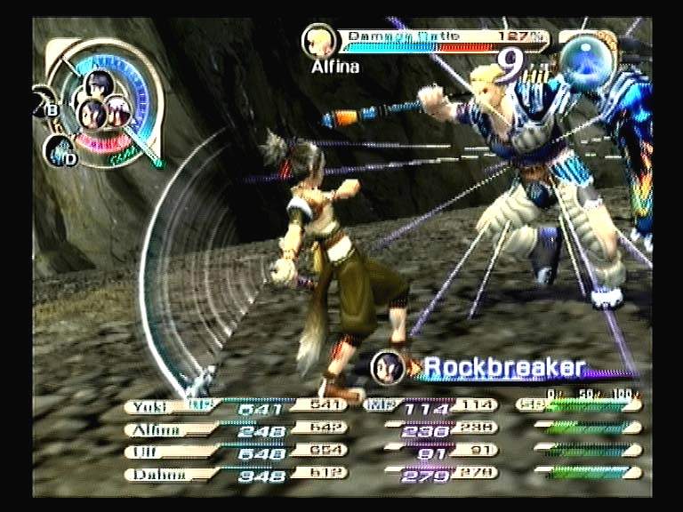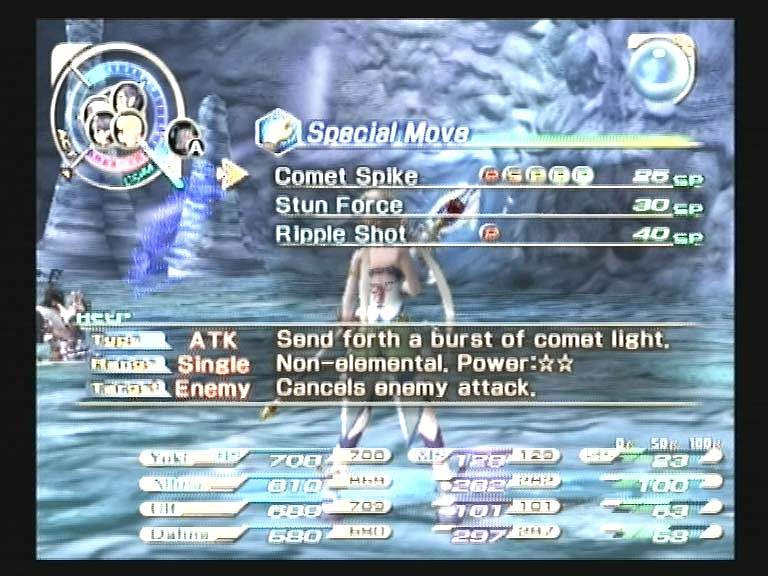 Во время первого промежутка (command-execution area) задаем героям команды на выполнение. Вторая фаза - совершение заданного действия. Для этого необходимо и сосредоточится, и подбежать к выбранному монстру, и размахнуться для удара. А время для разных приемов идет по-разному, поэтому персонаж в этот период наиболее уязвим для скоротечных критических атак, нередко отбрасывающих «приготовленца» к началу первого промежутка. Третий этап - небольшой отдых после атаки, за который можно внимательнее присмотреться к бойцам и выяснить, кого пора подлечить или кто готов для спецатаки.