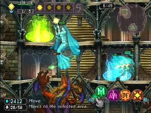 Бытует мнение, что на джойпаде невозможно играть в шутеры и стратегии. Как показал пример последней войны за тибериум на Xbox 360, все дело в интерфейсе и его освоении пользователем. В GrimGrimoire управление интуитивно понятно, а необходимый навык доводится до автоматизма в режиме принудительного обучения. Каждая кнопка отвечает за определенную функцию или подменю. Кроме того, происходящие события автоматически ставятся на «паузу». «Треугольником» – открывается режим строительства рун. «Квадратом» - ловим одного или нескольких бойцов, «крестиком» отправляем в схватку или на добычу маны. Выбор ближайшего монстра, выделение группы одного вида – отдано стандартным стрелочкам, а шифты L1-R1 предназначены для выбора конкретного действия из коротенького списка. Небольшое неудобство возникает при быстром перемещении от базы к базе, но с помощью паузы можно обойти и эту проблему. Гротескный дизайн и отличная англоязычная озвучка приятно порадовали глаза и уши игроков в предыдущей игре от Vanillaware – Odin Sphere. Харизматичные голоса актеров вместе с мелодичными мелодиями удержали планку качества на прежней высоте. С картинкой не все так однозначно. Беседы стали более живыми за счет плавного изменения эмоций героев, освещения и оживающих созвездий. Гораздо лучше воспринимаются шутки и флирт, обиды и заготовленные пакости. Чувствуется длинная история взаимоотношений между персонажами. Часть бестиария и немного декораций Odin Sphere переместились в GrimGrimoire, но самокопирование практически незаметно. Знамена не развеваются под порывами бешеного ветра, вода не журчит, а магма кипит где-то внизу экрана. Компенсировали недостачу спецэффектами на поле боя, потрясающей, плавной анимацией и четкой прорисовкой всех монстров. На этих кукольных тельцах видны мельчайшие детали, а на мордах и лицах четко отслеживается эмоциональное состояние призванных тварей. Мало того, в передвижении каждой из них легко читается характер. Трепетный живой полет феи сменяют мрачно-размеренные взмахи мечей призрачных рыцарей. Спокойная угрожающая походка демонов контрастно выглядит рядом со сдерживаемой мощью медлительных драконов, чьи тяжелые шаги сопровождает вибрация контроллера.
