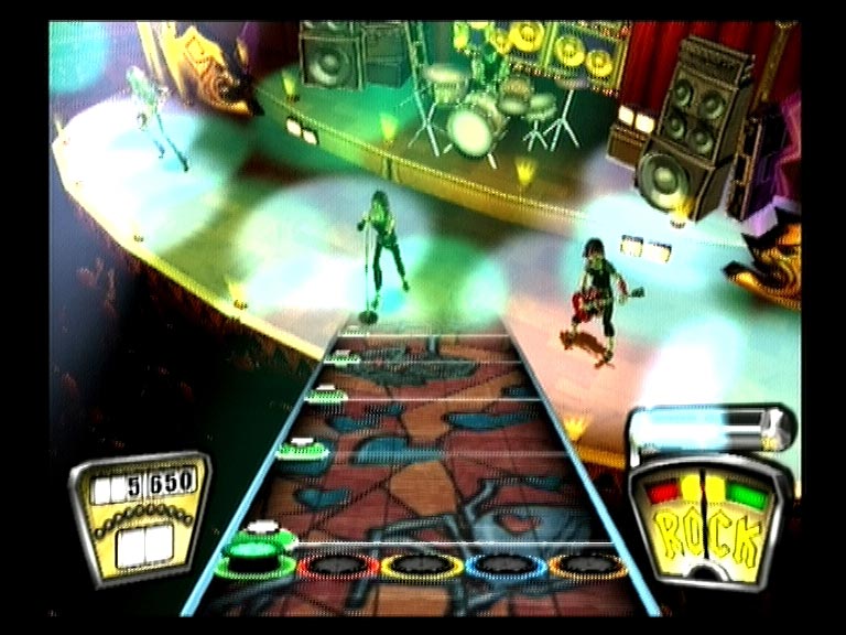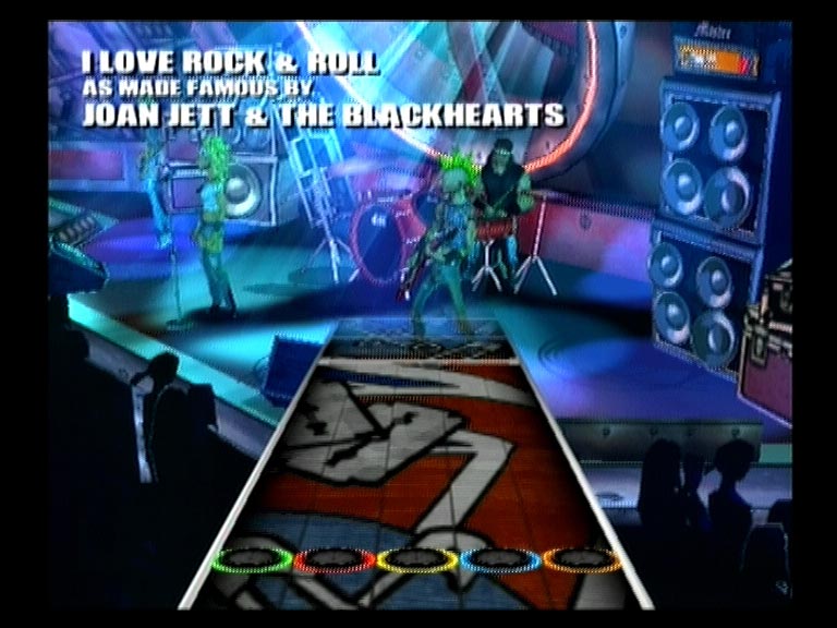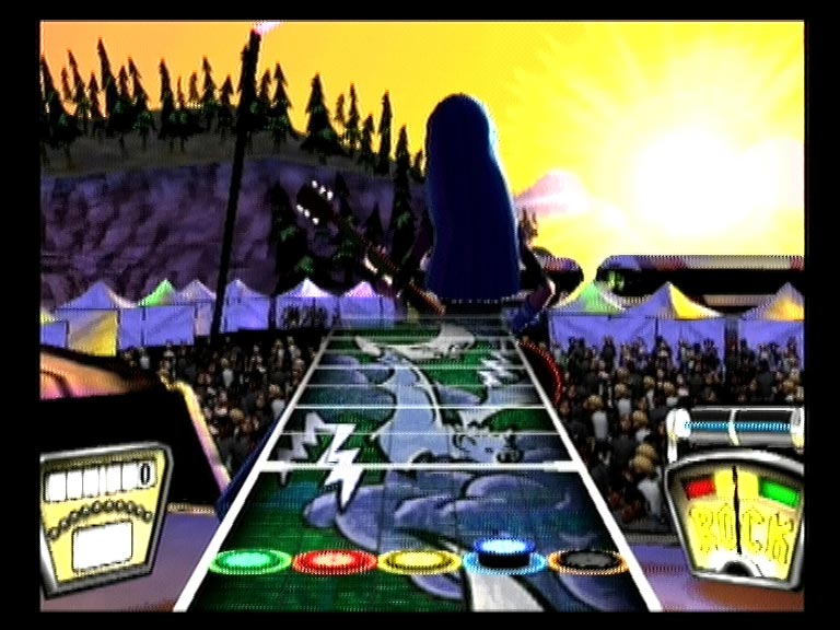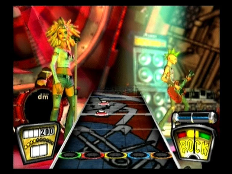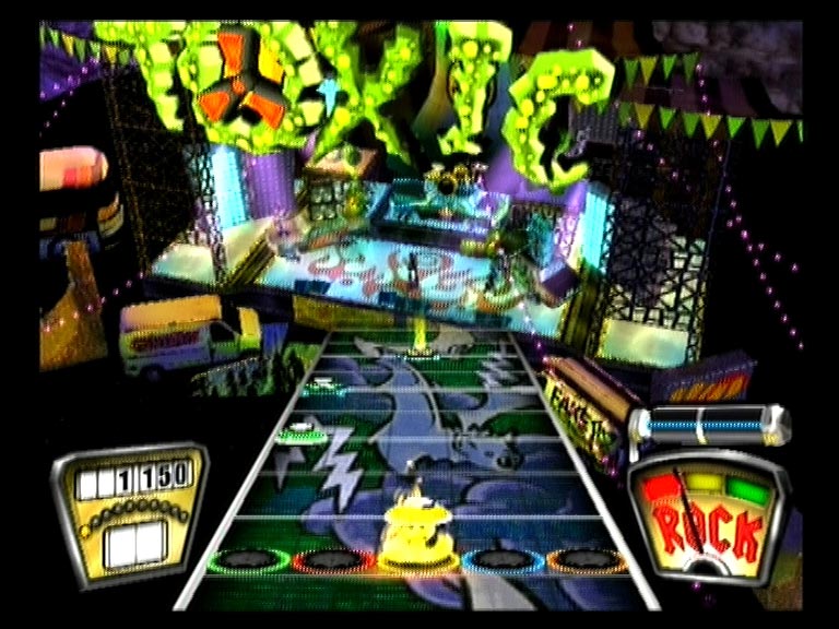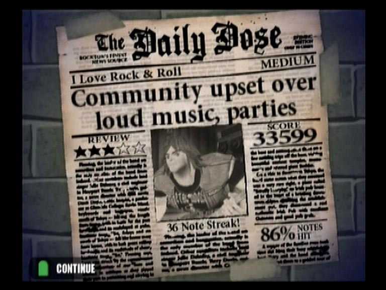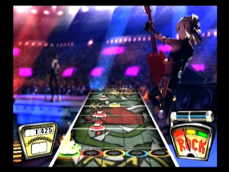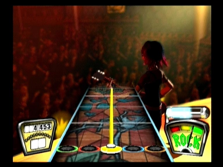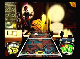 В соответствии с выбранным уровнем сложности нотный ряд выдается на три, четыре и пять струн. Темп мелодий разный и нередко меняется по четыре-пять раз за песню. Первый десяток в листе - ознакомление и тренировка, второй и третий - серьезная проверка мастерства и реакции. На высоких уровнях сложности без небольшой тренировки и зазубривания табулатуры справится с перебором компьютерных струн или удержать ноту будет тяжеловато. Аккуратность и качество исполнения можно увидеть на индикаторе Rock!, по недовольной мордашке персонажа, или вынуть тампоны из ушей и услышать недовольное ворчание и свист толпы. После определенного количества точных попаданий очки будут умножаться в два, три, четыре и восемь раз, соответственно. Пропустил или сфальшивил - извини, начинай сначала. А рев беснующейся толпы, заведенной музыкальным драйвом и восхищенной виртуозной игрой, сменится злобным свистом и агрессивным улюлюканьем. Быстро поднять настроение фанатам помогут «звездные ноты» - самые запоминающиеся аккорды исполняемого хита.