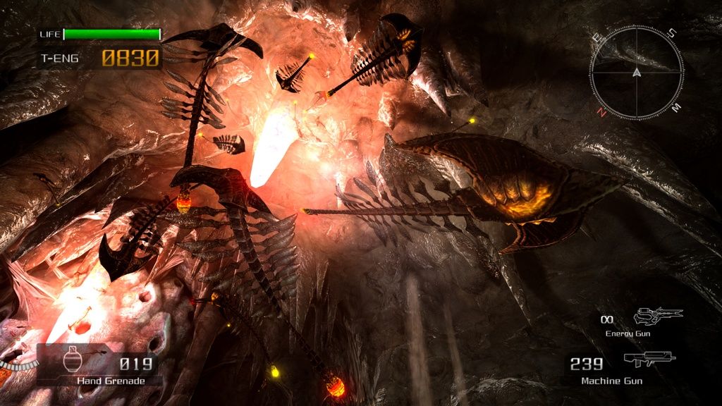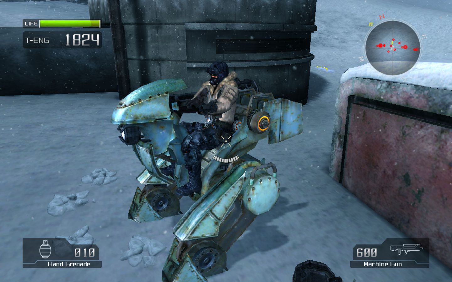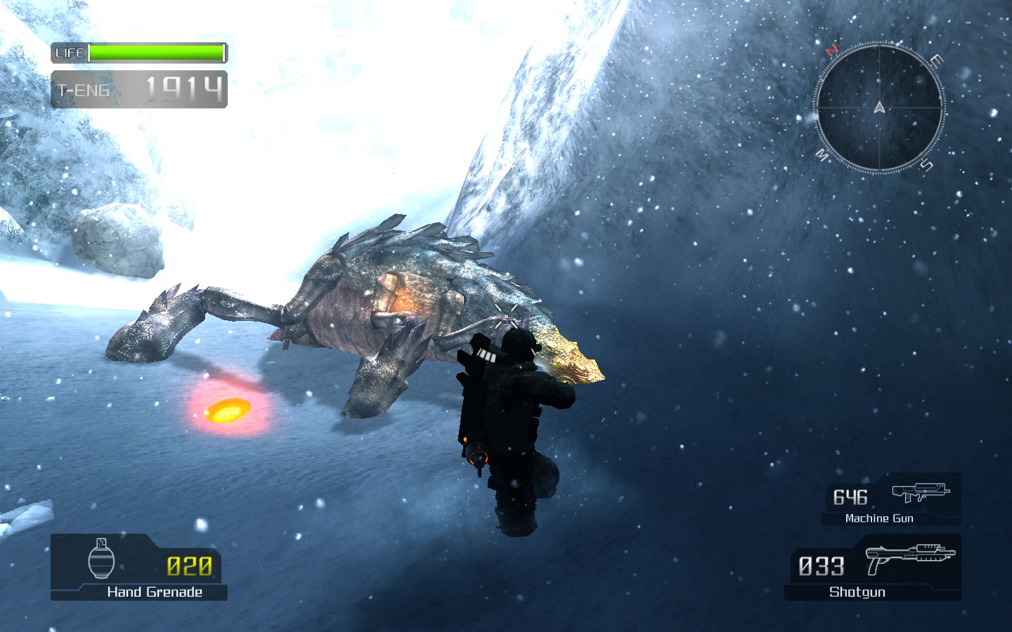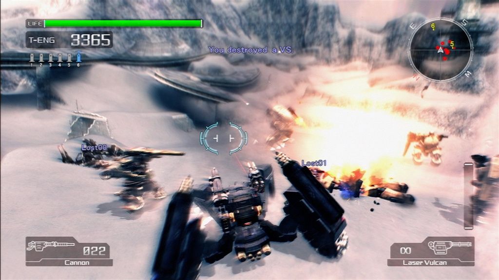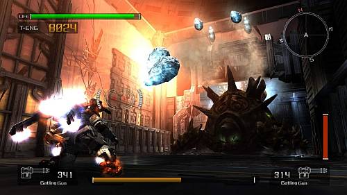 Остальное оружие также не выбивается из стройного классического ряда. Автомат, снайперская винтовка, ракетница и прочее - экзотикой порадовать постеснялись, так же, как и сбалансировать все это. Оружие мехов создано по образу и подобию, только гораздо больше и мощнее. Что примечательно, можно снять пулемет с искалеченного VS и продолжить потеху. Если, конечно, не смущает маленький человечек, бегающий и прыгающий со здоровенной пушкой в руках. О вынужденном равновесииЭнергией и самой драгоценной валютой в новом мире стало вещество под названием T-Eng (Termal Energy), которое, не позволяя организму замерзнуть, служит топливом для VS, а некоторым людям даже подходит в качестве лекарства, мгновенно залечивая раны. У каждого человека в обязательном порядке есть «термос» с этой ярко-оранжевой жидкостью. Если T-Eng заканчивается вне жилой зоны - человек умирает. С этим связана интересная особенность Lost Planet. Главный герой должен все время бежать вперед, пополнять запасы T-Eng, выливающегося из врагов, цистерн и разбитых мехов, чтобы не замерзнуть и снова бежать. Из-за этого сама игра может показаться излишне легкой. До встречи с боссом умереть почти невозможно, запасов T-Eng более чем достаточно. Уровни пролетаются быстро, весело, в огне и снежной пыли, но не оставляют запоминающихся впечатлений. «Бум-бух-бах» - и босс.