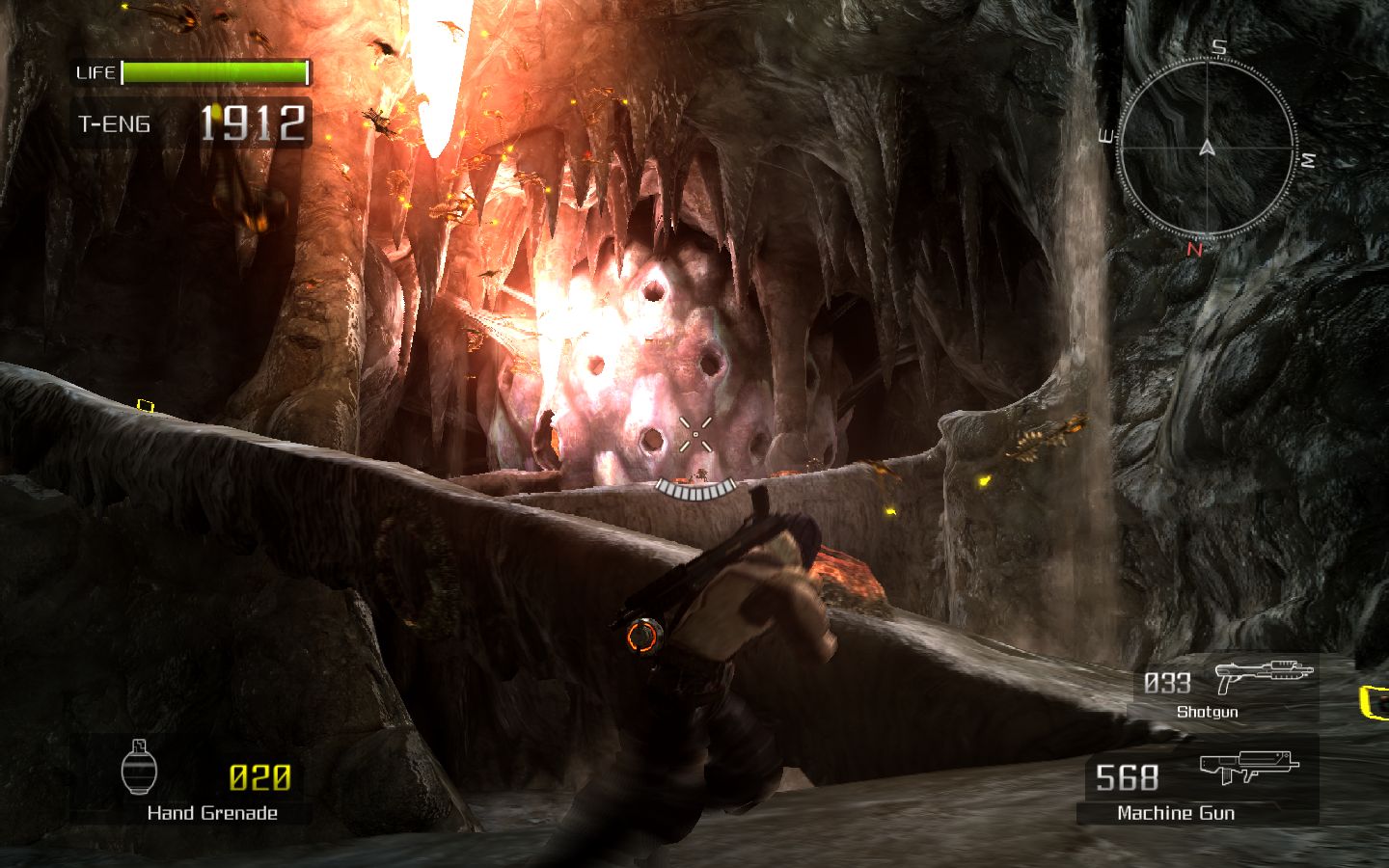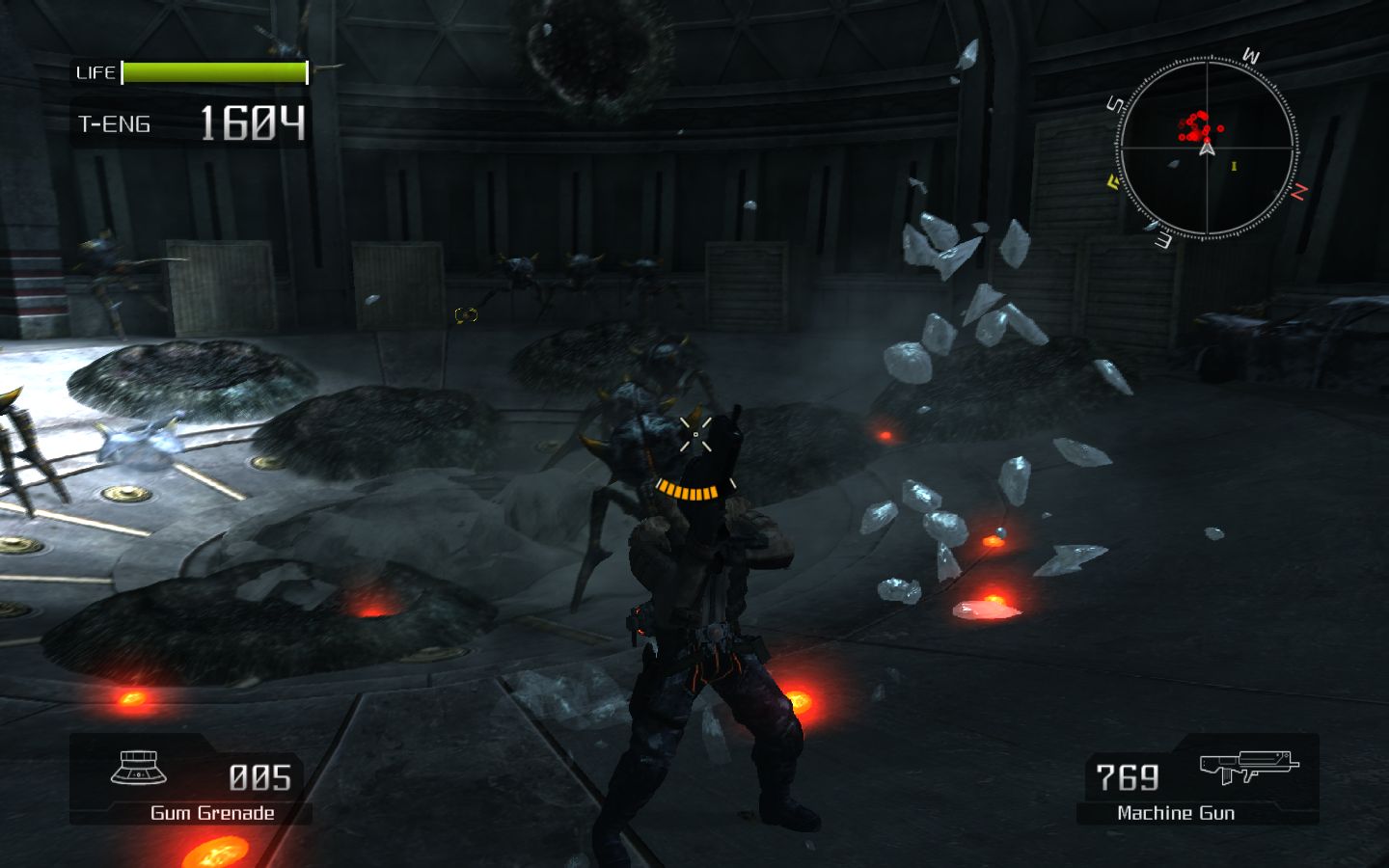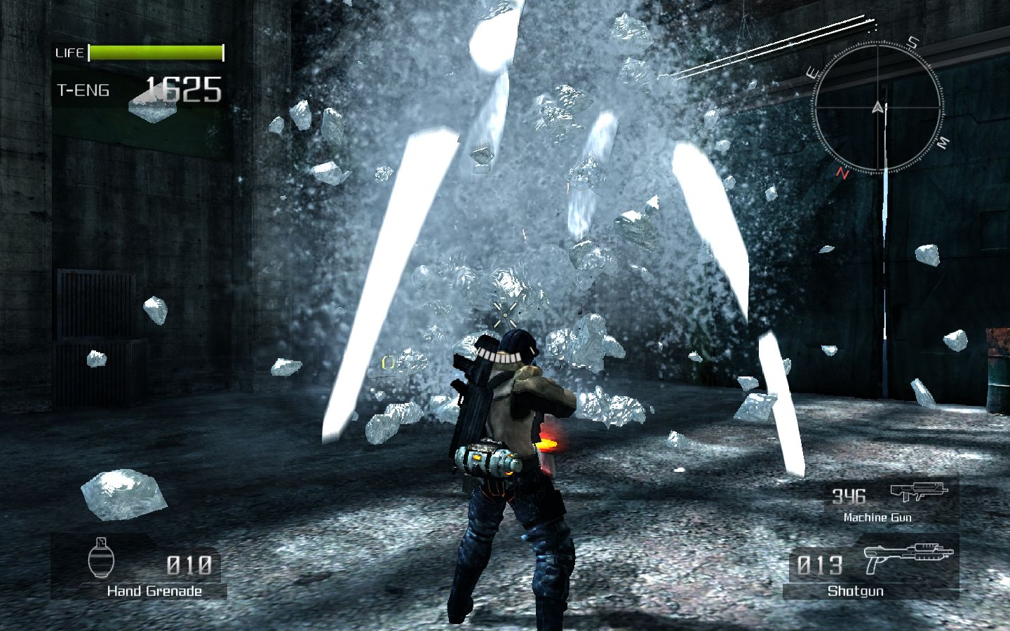 Остальное оружие также не выбивается из стройного классического ряда. Автомат, снайперская винтовка, ракетница и прочее - экзотикой порадовать постеснялись, так же, как и сбалансировать все это. Оружие мехов создано по образу и подобию, только гораздо больше и мощнее. Что примечательно, можно снять пулемет с искалеченного VS и продолжить потеху. Если, конечно, не смущает маленький человечек, бегающий и прыгающий со здоровенной пушкой в руках. О вынужденном равновесииЭнергией и самой драгоценной валютой в новом мире стало вещество под названием T-Eng (Termal Energy), которое, не позволяя организму замерзнуть, служит топливом для VS, а некоторым людям даже подходит в качестве лекарства, мгновенно залечивая раны. У каждого человека в обязательном порядке есть «термос» с этой ярко-оранжевой жидкостью. Если T-Eng заканчивается вне жилой зоны - человек умирает. С этим связана интересная особенность Lost Planet. Главный герой должен все время бежать вперед, пополнять запасы T-Eng, выливающегося из врагов, цистерн и разбитых мехов, чтобы не замерзнуть и снова бежать. Из-за этого сама игра может показаться излишне легкой. До встречи с боссом умереть почти невозможно, запасов T-Eng более чем достаточно. Уровни пролетаются быстро, весело, в огне и снежной пыли, но не оставляют запоминающихся впечатлений. «Бум-бух-бах» - и босс.