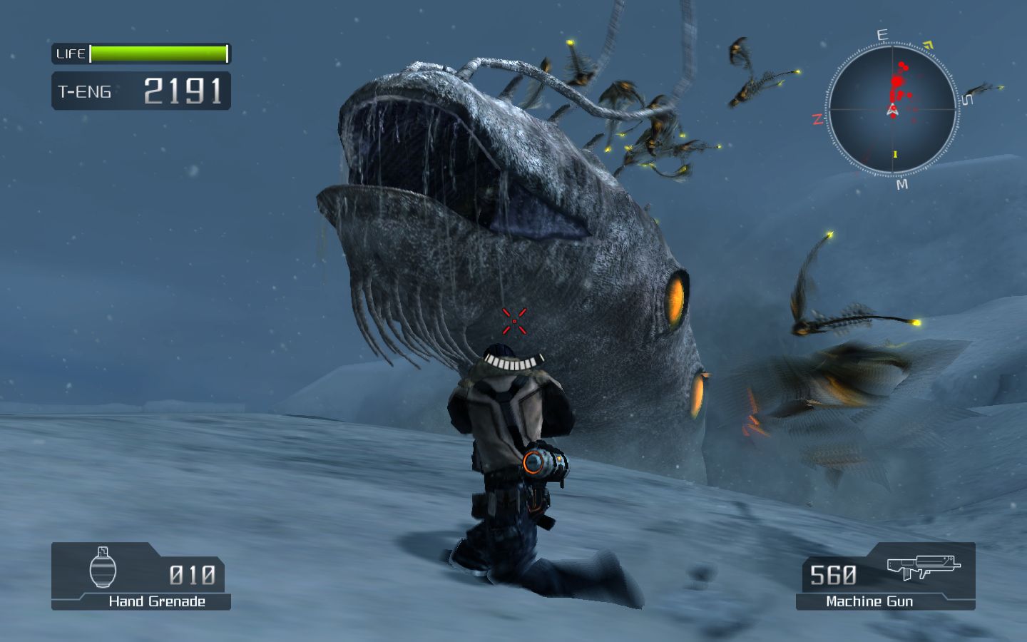 В этой одноклеточной забаве главный герой несется вперед, поливая свинцом все и вся без разбору. Враги умирают сотнями, ящики ломаются, бочки взрываются, машины разлетаются на куски, а картинка щедро сверкает спецэффектами. В конце уровня, как водится, сидит босс с длинной полоской жизни и «ахиллесовой пятой» где-нибудь на затылке. Пожалуйте, ваш пропуск на следующую миссию. О пользе гигантизмаБоссы... Существа удивительные. Встречаясь в очередной раз с каким-нибудь жуком-переростком, начинаешь понимать несчастную Дюймовочку. Как будто очутился в сказке, где вместе с людьми обитают гигантские мотыльки, червячки, стрекозы, скорпионы и прочие представители насекомообразной фауны. Они красивы, величественны и великолепны в своем стремлении расправиться с хлипким млекопитающим. Они посылают метеоритные ливни, закидывают ледяными булыжниками, кружат, набрасываются, сбивают с ног, а то и вовсе раскрывают бездонную пасть, намереваясь проглотить суетящуюся где-то снизу блоху с пулеметом. В этом описании нет и доли сарказма. Когда толщу сбившегося снега пробивать гигантский червь, когда небо заслоняет своими «крылышками» мотылек, когда сквозь стальное ограждение ломится жук размером с двадцатиэтажный дом, нельзя не проникнуться величием момента, ощутить себя Полом Атрейдeсом, которого преследует по пустыне Шаи-Хулуд*. Правда, укротить этих зверенышей не получится. Приходится кружить вокруг неповоротливых туш, прыгать, искать спасение за монолитными укрытиями и, конечно, стрелять из всех орудий, выбирая те, что мощнее.