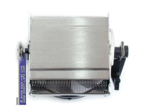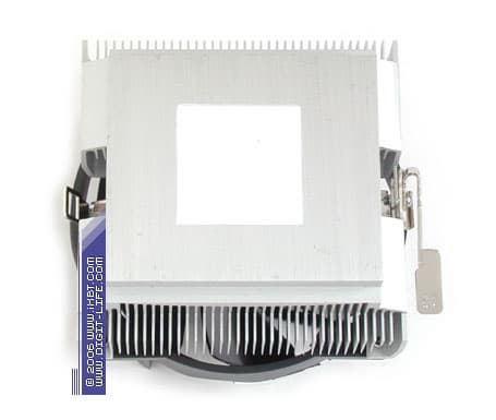 Следуя идеологии, традиционной для семейства Igloo, радиатор «новичков» Igloo 7310 принимает в актив знакомый нам набор катализаторов тепловой эффективности — ребро трапецеидального сечения и чередование высоты ребра (симбиоз этих инструментов нацелен на повышение термической и гидравлической эффективности оребрения), и получает наследственно высокотехнологичные параметры (толщина ребра в основании 0,5 мм и 0,2 мм у вершины, средний шаг размещения 2 мм, 34 рабочих ребра). При этом, благодаря рациональной геометрии оребрения, Igloo 7310 развивает несколько большую площадь поверхности теплообмена, чем его крупногабаритный прародитель Igloo 7300 (1900 см2 против 1800 см2 у Igloo 7300), одновременно сбрасывая в весе, с учетом вентилятора облегченного типоразмера, около 50 г (365 г против 415 г у Igloo 7300). Особого внимания заслуживает здесь и сам набортный вентилятор — он обладает отлично сконфигурированной крыльчаткой, которая оптимизирована сразу по двум направлениям — как в части производительности (баланса статического давления и расхода), так и в плане шумовых характеристик.