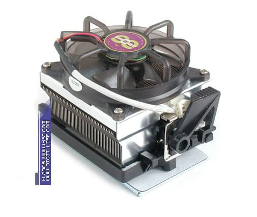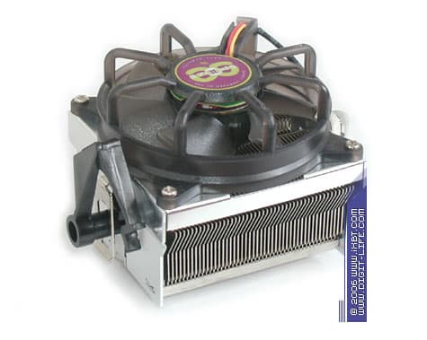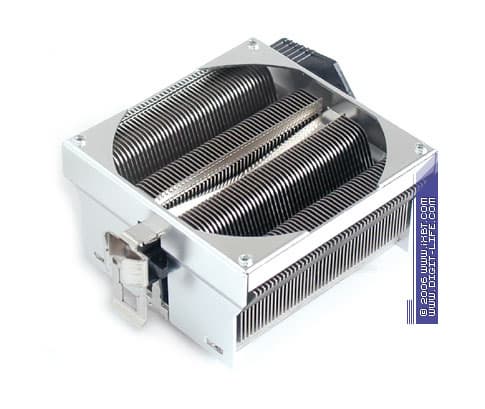 Далее в нашем списке фигурирует представитель продуктовой линейки Speeze, ориентированной на Socket 754/939, — «ветеран» CopperReef (артикул EE782B3), в бытность свою принадлежавший к «среднему классу», ныне переведенный в категорию «sale». Кулер базируется на медно-алюминиевом радиаторе 80х80х45 мм (эффективные габариты подошвы 76х68 мм), оборудован «инвертированным» вентилятором типоразмера 80х80х25 мм с номинальной скоростью вращения крыльчатки 2400 об/мин (комбинированный подшипник — подшипник качения плюс подшипник скольжения), оснащен референсным крепежом и укомплектован дополнительными установочными приспособлениями — монтажной рамой под Socket 754/939 и стандартизованной пластиной-супинатором.