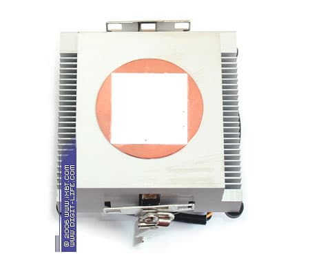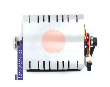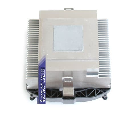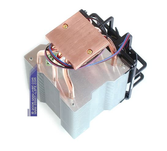 Особой «фишкой» M6 SE становится крупногабаритная медная пластина 70х60х3 мм, которая присовокуплена к подошве винтами и, по замыслу ребят из Thermaltake, нацелена на улучшение условий перераспределения теплового потока в тракте процессор-кулер. Прилично выглядит здесь собственно сам радиатор, демонстрируя оребрение с неплохими параметрами ребра (ребро трапецеидального сечения, толщина 0,8 мм в основании и 0,3 мм у вершины, средний шаг размещения 2 мм, общая площадь поверхности теплообмена около 1200 см2). Отдельного внимания также заслуживает весьма удобный в использовании фирменный крепеж, обеспечивающий аккуратную совместимость как с платформами Socket 754/939, так и с новым Socket AM2.