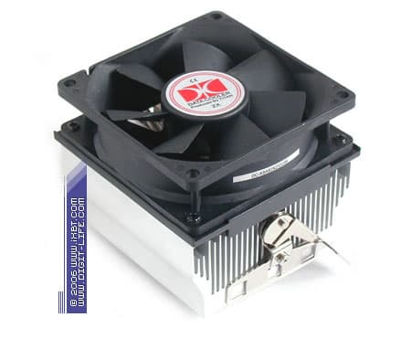 В конструктивном плане X Dream K640 предстает весьма солидным продуктом — основной «фишкой» кулера является медный сердечник 25х20 мм, запрессованный в подошву, хорошее впечатление производит также Х-образное радиальное оребрение с достойными техническими параметрами (ребро трапецеидального сечения, толщина 0,7 мм в основании и 0,2 мм у вершины, средний шаг размещения 1,5 мм, общая площадь поверхности теплообмена около 1400 см2). Другой интересной особенностью нашего подопытного становится система термоконтроля, которой оборудован его вентилятор — скорость вращения крыльчатки здесь варьируется от 800 до 2800 об/мин (в качестве температурного пробника используется термистор, закрепленный в верхней части оребрения, диапазон терморегулировки 35-55°C).