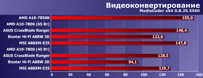 В общем и целом анализировать результаты платы Biostar не имеет особого смысла до тех пор, пока программисты не исправят ошибки в прошивке. Asus и MSI одинаковы с точностью до погрешности измерения, так что полученные цифры можно считать как раз правильными для А10-7800. И результат этого процессора неплох: отставание от А10-7850K менее 5% в «штатном режиме» и чуть более 10% в экономичном. Таким образом, процессоры четко разделяются по позиционированию: 7850K нужен любителям разгона, а вот 7800 всем остальным будет даже более интересен. Тем более что он способен конкурировать с энергоэффективными «квадами» и двухъядерными процессорами Intel напрямую, а не с поправкой на прожорливость.