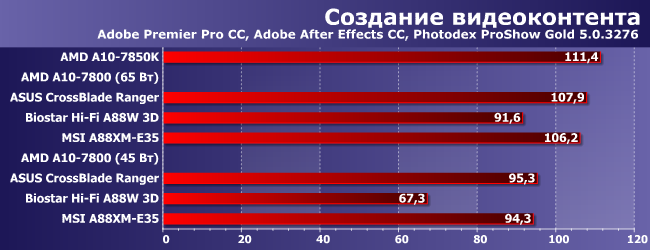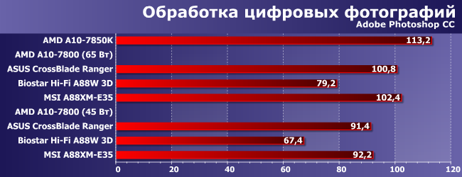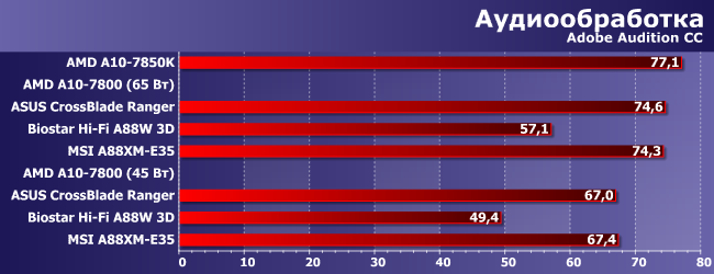 Audition CC еще больше тяготеет к двум-, а не четырехпоточным процессорам, но с применением OpenCL, так что тут 7800 «в родном режиме» почти не отстает от 7850K, резко снижая темп при переходе на 45 Вт. Естественно, происходит такое при нормальном управлении частотами процессорных ядер. Если у платы (или ее прошивки, что вернее) с этим есть проблемы, на результаты без слез не взглянешь.
