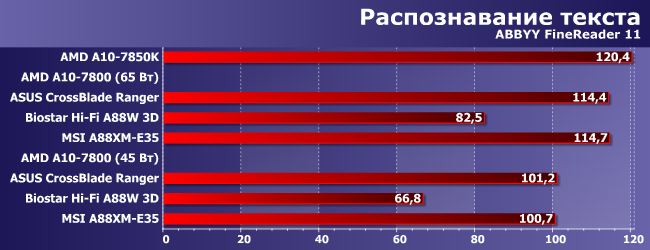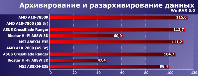 Причем, заметим, положение дел тем хуже, чем ближе тесты к «чисто процессорным». Фактически на Biostar Hi-Fi A88W 3D при снижении TDP до 45 Вт А10-7800 «тормозится» до уровня... Pentium J2900, что было бы смешно, если бы не было так грустно.