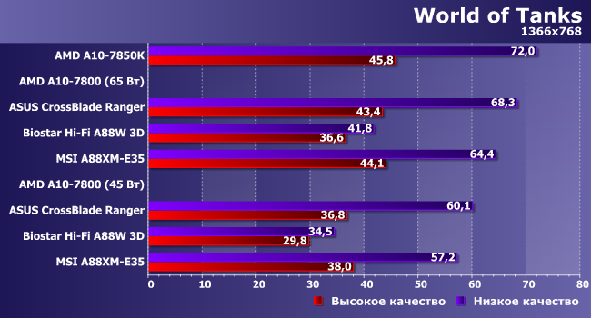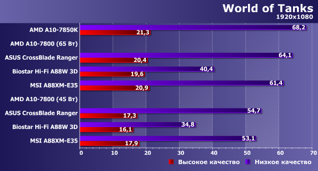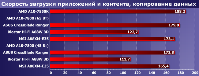 Причем все описанное выше относится к идеальному случаю: как оно может работать, если ничего не мешает. Но может мешать и материнская плата, с чем мы столкнулись при попытке повторить тестирование. В процессе решения проблем у нас образовался набор результатов, полученных на трех разных системных платах: Asus CrossBlade Ranger, Biostar Hi-Fi A88W 3D и MSI A88XM-E35. Все они основаны на одном и том же чипсете, все имеют позиционирование «выше среднего», но все работают по-разному. К сожалению, это относится не только к результатам — нам, например, не удалось «завести» на 2133 МГц никакие из имеющихся модулей памяти при использовании Asus CrossBlade Ranger. Точнее, все прекрасно работало в процессорных тестах, но вылетали все игровые — при том, что на двух других платах подобных проблем не возникло. В итоге игровые результаты отличаются и по этому параметру: для Asus они получены с DDR3-1866, а на двух других платах — в «полноценном» режиме DDR3-2133. Как это скажется — проверим.