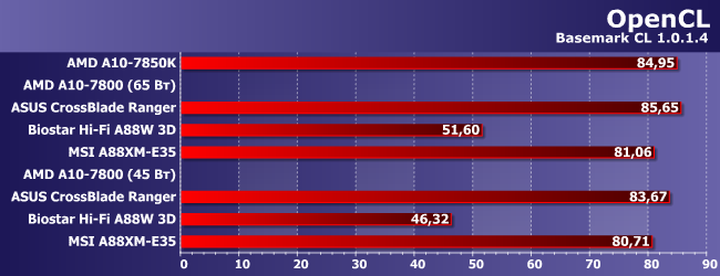 Платы Asus и MSI демонстрируют ожидаемый результат: 7800 немного отстает от 7850K в режиме 65 Вт, но теряет еще 15% производительности при снижении TDP. Все соответствует тактовой частоте: в первом случае она ниже на 200 МГц, а во втором на все 700. А вот с Biostar все плохо: даже на 65 Вт система работает медленнее, чем в случае двух других плат на 45 Вт, ну а в последнем режиме производительность вообще уходит ниже 100 баллов. Такое ощущение, что незначительное использование OpenCL-кода этой моделью определяется как серьезная нагрузка на GPU со снижением тактовой частоты ниже 3 ГГц.