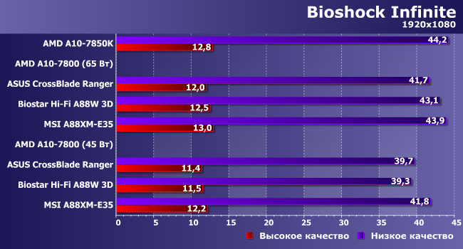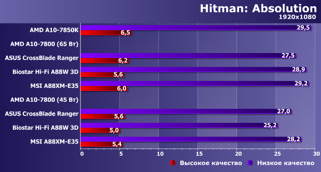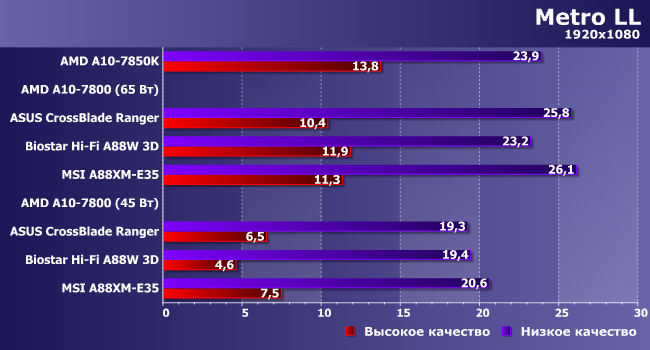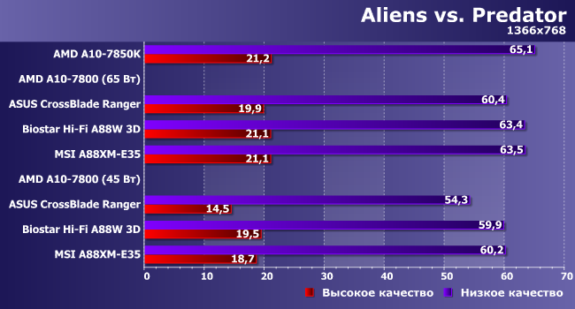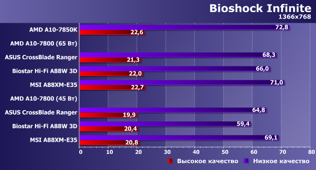 Вот здесь уже отстающей оказалась плата Biostar — по-видимому, влияние процессорной части на частоту кадров в данной игре более весомо.