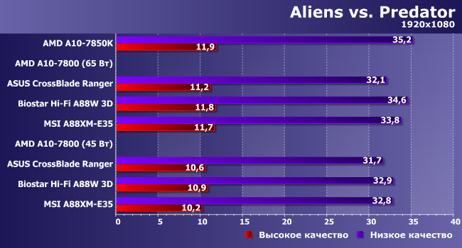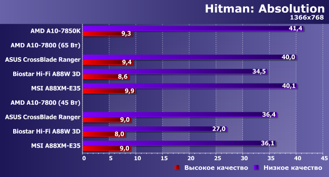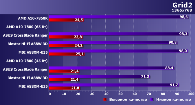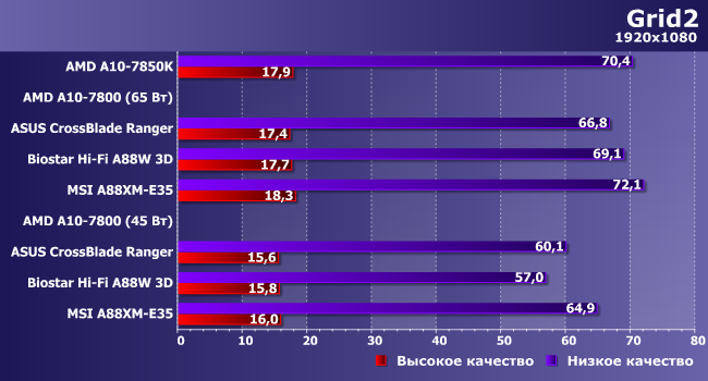 Тут — менее, но тоже ощутимо. Заметим, что в режиме 65 Вт результаты испытуемых ближе друг к другу и к 7850K: здесь не требуется управлять частотой GPU.
