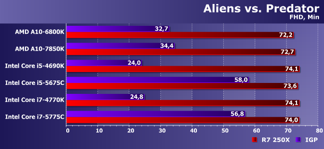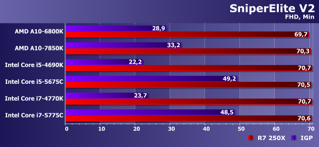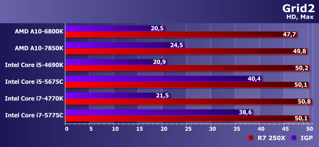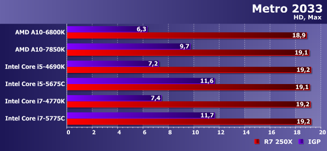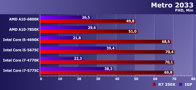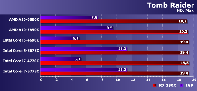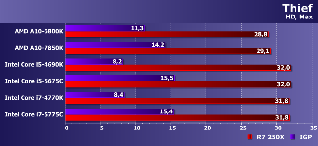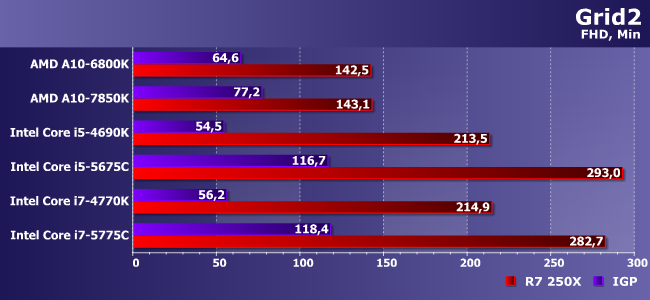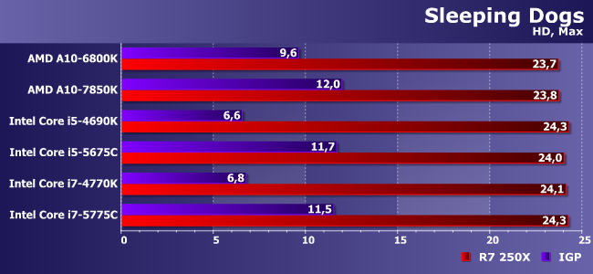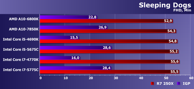 Очень тяжелая игра с которой не может справиться даже Iris Pro! Впрочем, как видим, здесь и 250Х хватает без особого запаса — в паре с медленными процессорами так и вовсе на пороге играбельности.