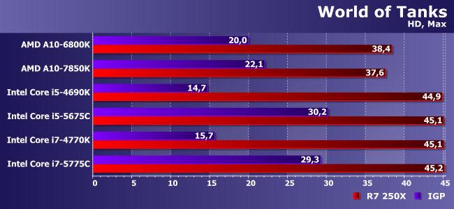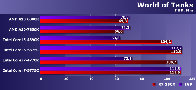 Но WoT, впрочем, прямая противоположность сформулированному выше — здесь графика нужна постольку-поскольку. Лишь бы не мешала. HD Graphics 4600 очевидно мало. Остальных — достаточно настолько, что при добавлении дискретной видеокарты производительность не увеличивается, а может даже снизиться.