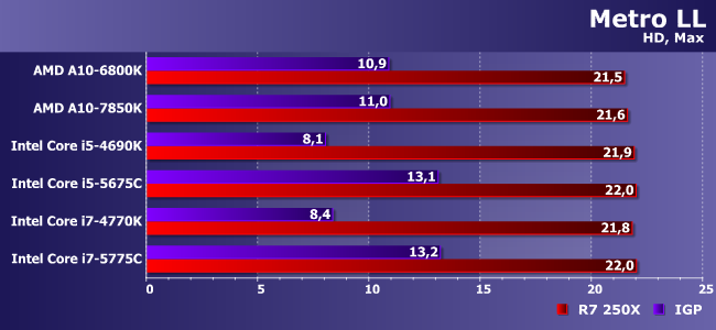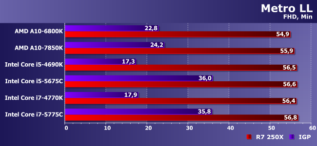 В предыдущей версии Metro расклад подобный. Правда тут уже А10 подбираются к порогу играбельности, но без натяжек пригодны только Broadwell-С и им подобные. Дискретка (даже такая относительно слабая, как 250Х) от производительности процессоров зато уже зависит. Другой вопрос, что «атлонов» по-прежнему хватит, а десятью кадрами в секунду можно и пренебречь.