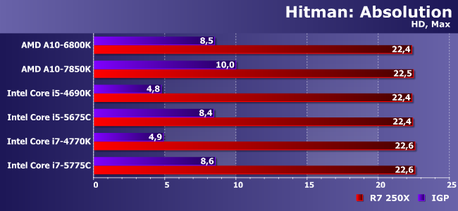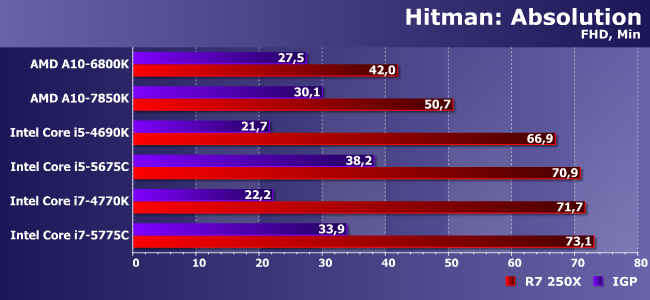 В очередной уже раз Hitman похож на Metro 2033 с небольшими вариациями. Например, здесь очень по-разному ведут себя два А10 разных поколений даже при использовании дискретки, т.е. оптимизации в Kaveri — не пустой звук. Однако как не оптимизируй, а Core i5 намного быстрее. Что же касается интегрированных решений, то тут снова без натяжек пригодны только Broadwell-С — на остальных придется снижать разрешение.