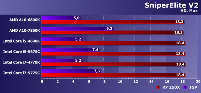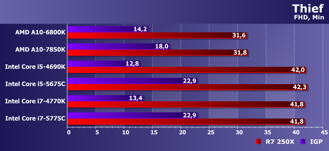 С большим трудом и напрягаясь Core i5-5675C выбрался за 30 FPS. Более дешевая связка из Athlon X4 760K или 860К и R7 250X не напрягаясь набирает почти 40. Комментарии излишни.