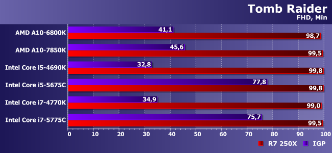 Как мы уже не раз говорили, в минимальном режиме Tomb Raider прекрасно работает на всем (или почти на всем). Впрочем, новые Broadwell тут все равно есть за что похвалить, поскольку не так уж сильно отстают от бюджетной, но дискретной видеокарты :)