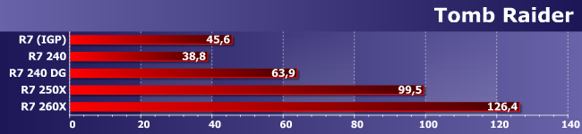 Tomb Raider в режиме минимального качества способен обойтись даже Radeon R7 240, а все остальные рассмотренные варианты еще быстрее. Правда, при увеличении качества в этой игре производительность падает очень быстро, так что (как мы уже установили) с максимальными настройками не справляется и R7 260Х. А нечто среднее будет допустимо и на R7 250Х, и на R7 260Х — естественно, с преимуществом второго решения.