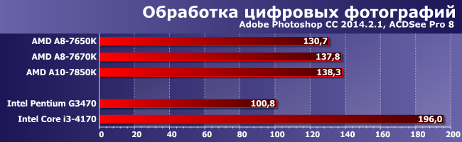 В старой версии Photoshop получалось сражаться только с Pentium, обновление программы, доработка методики тестирования и «усиление» ее еще одной программой (причем поддерживающей пакетный режим работы) позволило занять промежуточное положение между этим семейством и более дорогими Core i3. Опять же, важным будет то, насколько более дорогим: разница в производительности, все же, очень велика.
