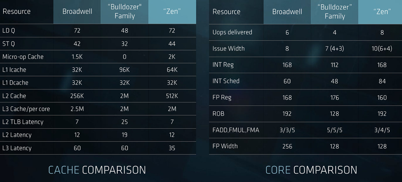 Если сравнивать микроархитектуру Zen с другими, то в новой заметно улучшили задержки во всем чипе, включая задержки кэш-памяти, которые значительно снизились. По данным компании AMD, задержки в Zen, связанные с кэш-памятью второго и третьего уровней сравнимы или даже чуть лучше задержек архитектуры Intel Broadwell и обе они, конечно же, значительно опережают предыдущее поколение микроархитектуры Bulldozer.