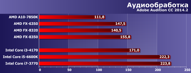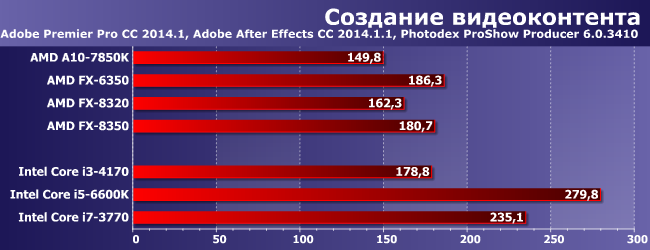 Вопреки «бытовым предположениям», работа с видео вовсе не всегда является примером хорошей утилизации многопоточности, так что тут положение дел радикально меняется. Хотя, с другой стороны, все равно привлекательно выглядит FX-6350, который сумел обогнать даже «восьмиядерники», но почему такое происходит мы уже не раз писали: одному из тестов просто недостаточно 1 ГБ памяти на поток при использовании дискретной видеокарты. Выяснилось это уже через несколько месяцев после начала использования тестовой методики, поэтому менять подход было поздновато, да и через пару месяцев все равно всю методику менять (причем заметим, что из новой версии Adobe After Effects режим Multiprocessing попросту исчез). Но, в принципе, несложно заметить, что эта группа вообще не слишком благосклонна к FX, которые все «толпятся» где-то на уровне Core i3 и ниже.