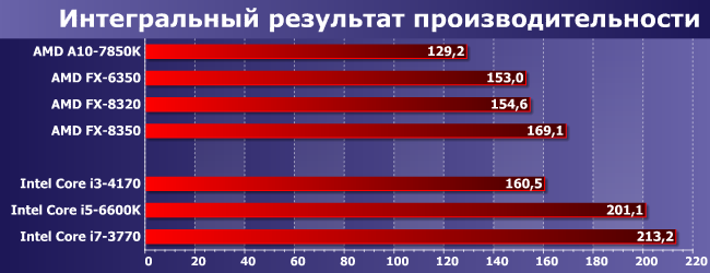 Что имеем в сухом остатке? Высокочастный трехмодульный процессор примерно равен четырехмодульному, работающему на более низкой частоте, но стоит дешевле. Впрочем, для части пользователей штатная частота значения не имеет, поскольку все процессоры семейства FX имеют разблокированные множители, так что самый младший можно превратить не только в 8350, но и в аналог моделей семейства 9000. Если, конечно, это будет сочтено нужным. А в штатном режиме тот же 6350 выглядит интереснее, благо у него прямых конкурентов в ассортименте Intel, например, нет. Однако в целом последней компании и не приходится конкурировать с AMD — более со своими старыми разработками, причем относительное позиционирование разных устройств сохраняется, т.е. Core i7 трехлетней давности уж как минимум не хуже самого нового и лучшего Core i5.