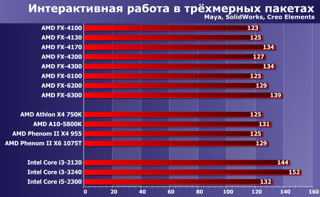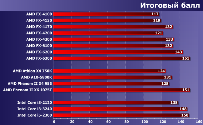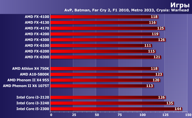К чему приходим? FX-6300 процессор интересный: в равных условиях обгоняет любые Phenom II X6, да и от предыдущих FX-6000 как минимум на 5% отрывается — немного, но неплохо. А вот FX-4300 — странная модель: этот процессор самый быстрый среди всех двухмодульных моделей AMD, но… Маленький и медленный кэш третьего уровня низводит преимущества обновленной архитектуры до номинального: 1 балл сравнительно с FX-4170 и 2 — с A10-5800K это не победа. А равный Core i3-2120 результат — вовсе разгром: на момент написания статьи второй процессор стоил дешевле, т. е. FX-4300 лишен даже столь любимого поклонниками AMD козыря, как цена. Причем это его персональная проблема — 6300-то в играх «приличного поведения» выглядит куда как лучше.