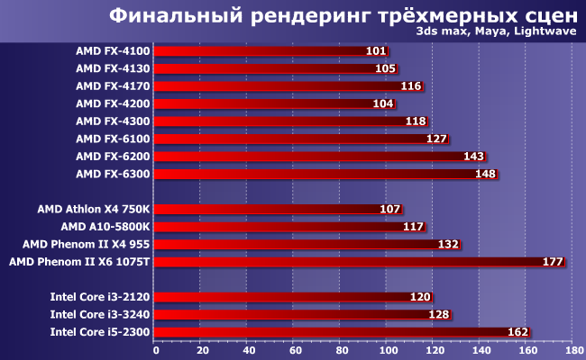 Давно замечено, что эти две программы недолюбливают новую архитектуру AMD, но, как выяснилось осенью, к Bulldozer это относится в большей степени, чем к Piledriver. Действительно — в позапрошлогоднем поколении ни одна из моделей не могла догнать даже весьма пожилой Phenom II X4 955, волей судьбы переместившийся уже в бюджетный сегмент. А вот что касается новых процессоров для АМ3+, то на это способен уже и FX-4300. С другой стороны, не побрюзжать по поводу его результатов мы все равно не можем: разница между FX-6300 и FX-6200 больше, чем отрыв FX-4300 от FX-4170. На это можно, конечно, возразить, что просто 6200 был куда менее убедителен на фоне 6100, чем 4170 сравнительно с 4100, однако важен конечный результат.