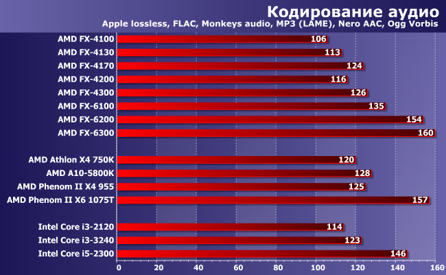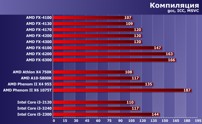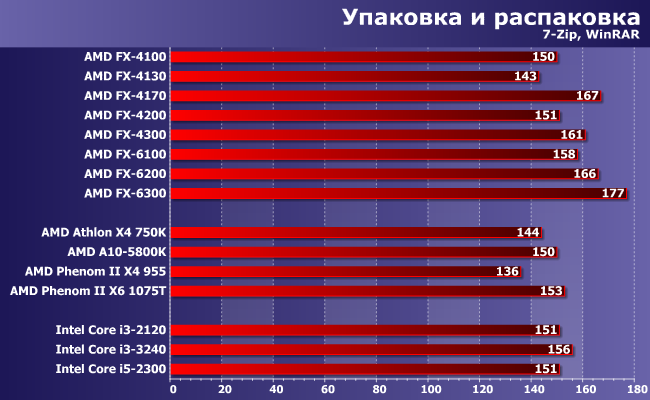 Важен кэш, причем, как видим, в первую очередь емкость, а не частота: FX-4130 сильно отстал от 4170 и 4200 с той же частотой UnCore. Но эта пара держится на одном уровне, несмотря на более высокие частоты первого, а еще им в точности равен FX-4300, которому не помешало ни урезание объема L3, ни меньшая его частота — новая микроархитектура лучше. Также эта тройка обошла все Core i3, а все FX-6000 справились и с Core i5-2300, хотя в целом данную группу тестов удачной для новой архитектуры AMD мы назвать не можем из-за укоризненно возвышающегося надо всеми старого Phenom II X6 1075T. Да и то, что (уже) бюджетный «распродажный» Phenom II X4 955 не только с легкостью разгромил все двухмодульные модели, но и к трехмодульным приблизился сильнее, чем отдалился от двухмодульных, тоже своего рода немой укор инженерам компании. С другой стороны, «распродажи» сильно ограничены по времени, а если рассматривать только современные процессоры ценой 100-150 долларов, то здесь уже FX-6300 является однозначным лидером, способным конкурировать и с младшими моделями Core i5 (в т. ч. и современными, а не позапрошлогодними), «живущими» «этажом выше».
