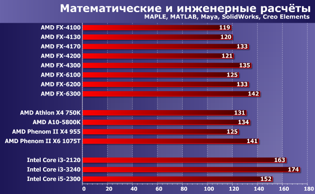 Мы не раз писали, что эти программы восприимчивы к кэш-памяти, однако, как видим, L3 последних архитектур им не интересен — либо слишком медленный, либо L2 хватает. Ну а преимуществ новой микроархитетктуры перед старой почти нет. Точнее есть, но небольшое — 4300/6300 по производительности схожи с 4170/6200, но при теплопакете на уровне 4100/6100. Тоже своеобразное достижение, особенно интересное для FX-6300: этот процессор побыстрее Phenom II X4 или там Core i3. А вот FX-4300, в свою очередь, не внушает особого желания к приобретению — любопытнее выглядят более дешевые решения для FM2 ;)