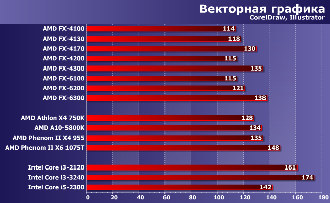Малопоточная группа тестов, как нельзя лучше подходящая для Core i3, но оставляющая «вне игры» Phenom II. При этом достаточно благосклонная к младшим конфигурациям Piledriver, возвышающимся над «замбезийским болотом». Достаточно мрачным: единственным светлым местом в нем можно считать только FX-4170, который быстро меркнет если вспомнить его цену и, мягко говоря, не слишком адекватный для двухмодулных процессоров уровень TDP. И при всем при этом процессор сумел победить только Trinity, но не Vishera. Но и Vishera «Вишере» рознь — если FX-4300 лишь равен 4170 и на самую малость превосходит А10-5800К, то 6300 более убедителен. Пусть малопоточные приложения и не его стезя.