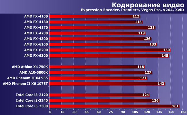 А вот и неприятности — что 4300, что 6300 отстали от своих «стероидных» предшественников. Во многом, впрочем, из-за того, что последних, действительно, накачали гормонами в виде тактовой частоты в режиме полной загрузки: примерно 10% преимущества отыграть сложно. Хотя 6300 это удалось в большинстве тестов, а 4300 — почти удалось: «камнем преткновения» для обоих оказался достаточно древний XviD, где, как мы уже не в первый раз видим, Piledriver уступает Bulldozer. С другой стороны, даже при таком неудобном стечении обстоятельств, 4300/6300 на фоне предыдущего поколения выглядят не так плохо, как кажется на первый взгляд — они экономичнее, так что если учитывать и этот фактор, проигрыш превращается в победу. А если привлечь к вопросу и цену, все становится еще более интересным: фактически-то FX-6300 конкурирует не со старыми шестиядерниками AMD и Core i5, а с Core i3.
