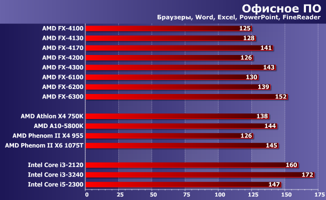 Зато на малопоточном коде «строительная техника» пусть и уступает решениям Intel, но на фоне Phenom II смотрится неплохо. Но по-разному: если FX-6300 оказался самым быстрым из сегодняшних участников (из ассортимента AMD, конечно), то FX-4300 убедителен лишь на фоне «болота», типа 4100/4130/4200. Он, конечно, сумел опередить и FX-4170, да и обе модели под FM2, однако победу сложно считать отличной от чисто номинальной. Вот если бы разработчики, хотя бы, не «обрезали» ем у кэш-память, могло бы все получиться немного лучше, ну а при таком раскладе доплачивать за FX стимулов не наблюдается — Athlon стоит намного дешевле, а А8/А10 «в нагрузку» снабжены неплохим (для данной сферы использования) графическим ядром.