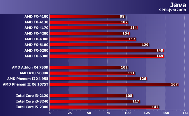 А тут она же, но уже более весомая — все-таки для приложений предыдущей группы все сегодняшние участники избыточны, да и используются ими лишь частично. SPECjvm2008 же неплохо поддерживает многопоточность, так что способен загрузить работой любой современный процессор. Предпочитает он, правда полноформатные ядра «старого образца», но и к другим способам увеличения количества одновременно исполняемых потоков вычисления неравнодушен. Так что то, что FX-6200 обгоняет (пусть устаревший и снятый с производства, но настоящий) Core i5 — уже было неплохим результатом. А имеющий ту же производительность, но при меньшем энергопотреблении FX-6300 — еще лучше.