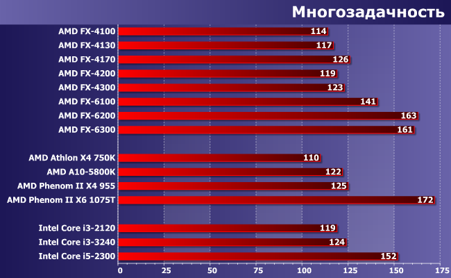 Ничего нового — однопоточная производительность (которая здесь важна) в новом семействе подросла, что позволяет опережать предшественников, но не угнаться за современными процессорами Intel. С другой стороны, Core i5 тут тоже не в лучшем положении, особенно если взять младшую модель двухлетней давности, так что уж его-то FX-6300 обогнать смог. Небольшая, но, все же, победа.