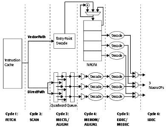 - 4. ALIGN2 «Выравнивание 2»: разбор (синтаксический анализ) инструкции в каждом из трех каналов с выделением префиксов, кода операции, байтов ModR/M и SIB и отсылка отсортированной информации на следующий этап для завершения раннего декодирования и генерации mOP-а. Инструкции типа VectorPath одновременно обрабатываются в своем устройстве декодирования. На этапах 3 (MECTL) и 4 (MEROM) происходит адресация и выборка «микрокода», необходимого для генерации mOP-ов на следующем этапе.