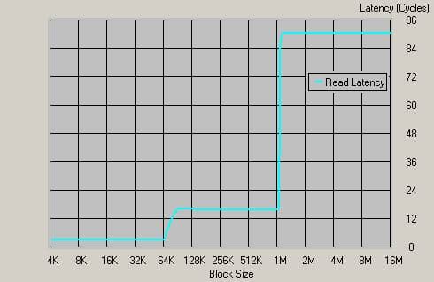 Впрочем, пора переходить к делу — итак, какие же результаты демонстрирует нам подсистема памяти Athlon 64 и Opteron-а? В связи с принципиальной новизной микроархитектуры мы постарались сделать тесты как можно более разнообразными. Для начала поглядим на латентность подсистемы памяти — тем более что ранее именно в этой области мы обещали прорыв. Для наблюдения за латентностью воспользуемся утилитой Cache Burst 32: