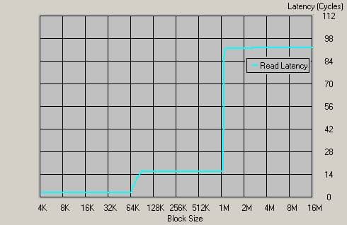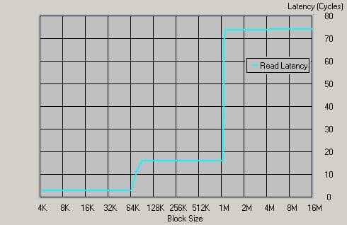 Мы видим 74 такта задержки, что соответствует приблизительно 45 нс!!! Это по-прежнему сравнимо со временем доступа к ячейке динамической памяти! Можно только выразить восхищение эффективностью такого решения, как встроенный контроллер памяти. Кстати, в текущей ситуации можно сравнить с задержками контроллера памяти процессора Opteron, который, как мы помним, использует Registered память (подчеркнем еще раз: наличие ECC при этом не обязательно!).