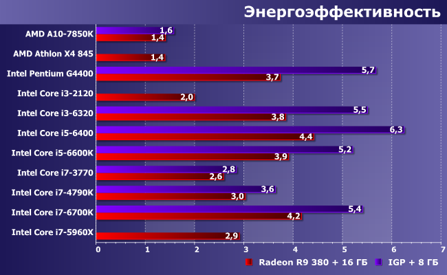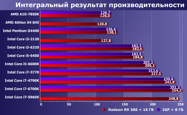 Восемь систем были протестированы и с использованием встроенного графического ядра при наличии 8 ГБ оперативной памяти: в точности, как мы поступаем всегда в «основной линейке» тестов. Остальные три так использовать не получилось, поскольку в двух процессорах IGP просто нет, а еще один в такой конфигурации уже вызывает проблемы с частью приложений. Но основным «тестовым режимом» в любом случае был не этот — в наибольшей степени нас интересовали результаты в паре с дискретной видеокартой, в качестве которой использовался Radeon R9 380. На сегодняшний день далеко не самое мощное решение, но, в принципе, пригодное для (все еще) не слишком дорогого игрового компьютера. Либо просто компьютера, на котором планируется более-менее регулярно играть. Без особого фанатизма (иначе имеет смысл покупать более мощные видеокарты, а не тратиться на топовые процессоры), но и не ограничиваясь минимальными настройками игр трехлетней давности. А заодно, как раз и неигровое использование оценим.