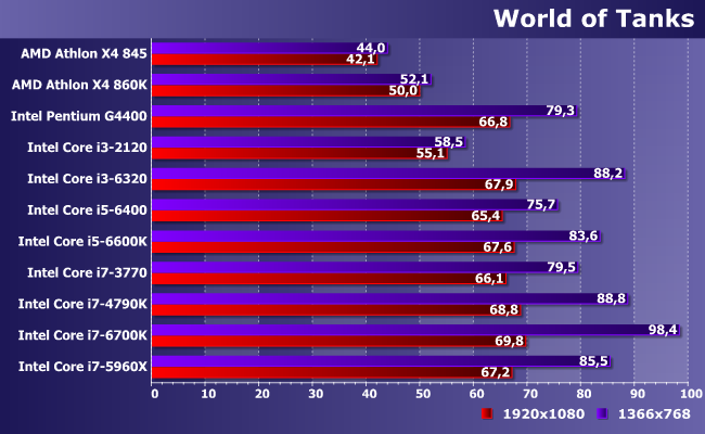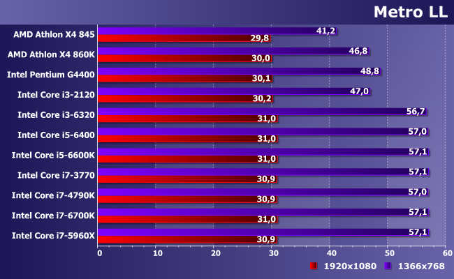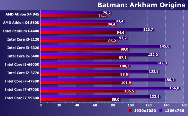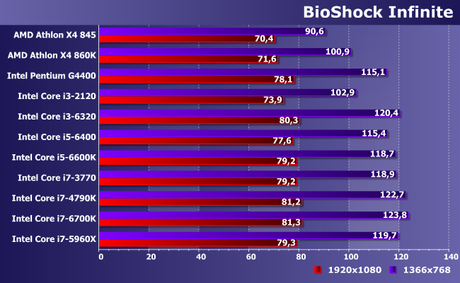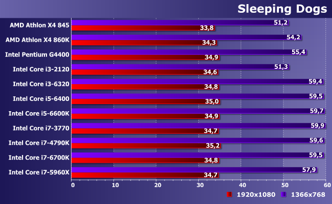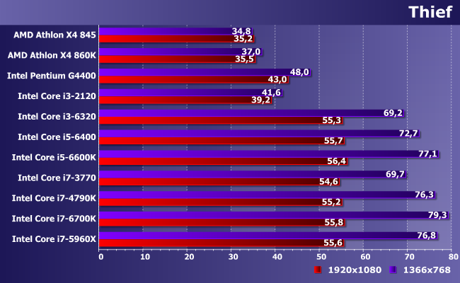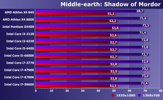 Один из немногих случаев, когда лучше иметь больше ядер меньшей частоты, чем меньше — большей. При использовании одинаковой микроархитектуры последних, разумеется: разницы из-за этого фактора за прошедшие годы набежало немало. В итоге и видим, как современный Pentium с легкостью побеждает что старые Core i3, что Athlon X4, однако с качественной (а не количественной) точки зрения всех упомянутых недостаточно для полного задействования возможностей данной (уже далеко не топовой) видеокарты в этой конкретной игре. А вот современных Core i3 — достаточно, хотя при снижении разрешения (и нагрузки на видеокарту, соответственно) даже 6320 оказывается самым медленным из «достаточных» испытуемых. Ну и, собственно, что? С практической точки зрения — уже ничего. В отличие от бюджетного сегмента, представители которого, как видим, производительность ограничивают критичным образом.
