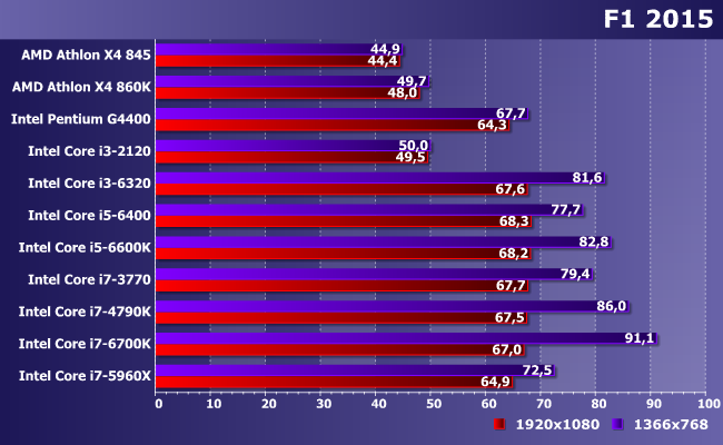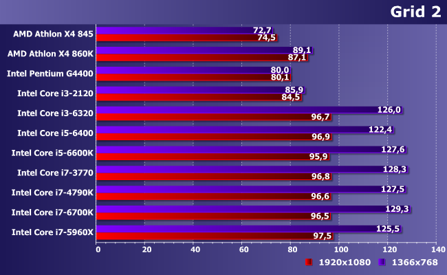 Старые гонки — один из немногих случаев, когда «четыре потока лучше двух». Впрочем, придавать этому существенное значение стоит лишь тогда, когда потоки одинаковые — например, Pentium и Core i3 одного поколения. Если разных, то может получиться и так, что разница окажется номинальной. Но она есть — старенький i3-2120 все-таки обгоняет современный Pentium G4400 той же частоты. А вот дальше — опять «выходим на видеокарту». Увеличив мощность последней, скорее всего, сдвинем и «точку насыщения», хотя при частоте кадров over 90 даже при максимальных настройках это, конечно, имеет уже чисто теоретическое значение.
