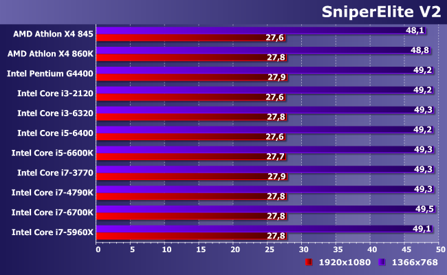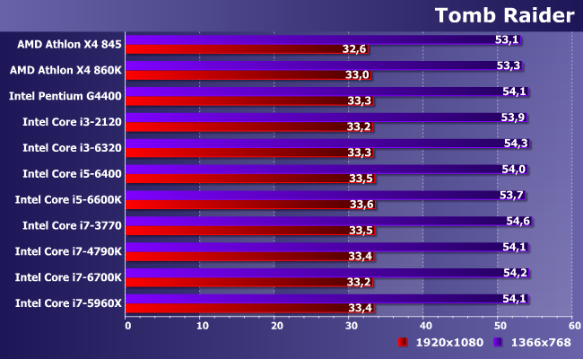 А вот пример игры, где производительность в основном определяется видеокартой. С другой стороны, частоты кадров в FHD маловато, так что на практике нужно будет снизить разрешение и/или качество изображения. Или приобрести более мощную видеокарту — во всех этих случаях хорошо видно, что старых или бюджетных (тем более, старых бюджетных) процессоров будет «маловато». Но лучше так, чем с любым процессором и старой или бюджетной видеокартой :)