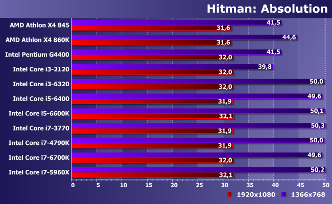 Hitman хорошо «ложится» на архитектуру AMD, что, тем не менее, процессоры конкурента вполне могут переломить грубой силой. В общем, «точка насыщения» здесь там же, где и в большинстве прочих игр — в районе современных Core i3. Причем только в низком разрешении или ослабленных настройках — в противном случае в видеокарту «упереться» намного проще. Особенно в тех случаях, когда стоимость таковой оказывается сопоставимой или даже более низкой, чем у используемого процессора — такие перекосы в игровом компьютере недопустимы. Но возможны, если игры — не единственное и не главное предназначение последнего.