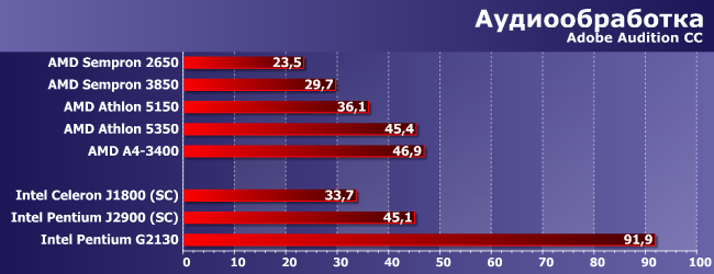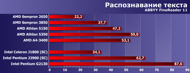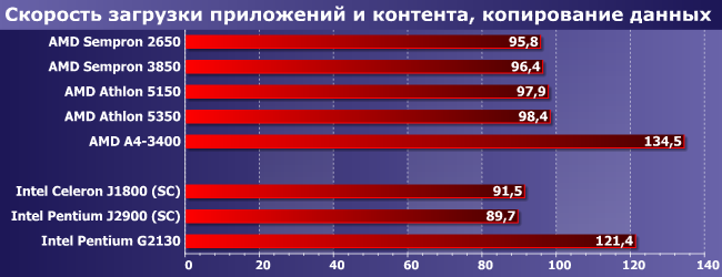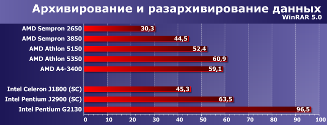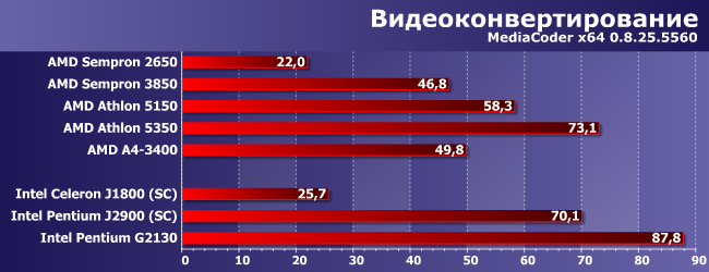 Степень утилизации четырехъядерных моделей у этих тестов ниже, чем у предыдущего, так что здесь уже Celeron J1800 наступает на пятки Sempron 3850, а A4-3400 отстал только от Athlon 5350. Лидеры — два Pentium. Но по-разному: если G3250 способен обгонять суррогаты раза в два-три, то J2900 и есть суррогат, так что не слишком отличается от себе подобных :)