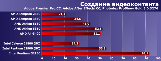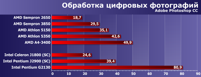 Photoshop некоторые считают «хорошо оптимизированной» программой, хотя на деле относится это лишь к некоторым фильтрам, а при решении более распространенных задач, как видим, даже четырехъядерные суррогатные процессоры последнего поколения все еще не могут угнаться даже за стареньким A4-3400, т.е. и, например, за любым Athlon X2 (благо младший Х2 215 примерно равен А4-3400) или Celeron E3200 и выше под старый добрый LGA775. Ну а с более свежими «селеронопентиумами» и сравнивать нечего. Полноценными, разумеется, а не «атомными» — J2900 как видим еще хуже «атлонов», поскольку на видеоядро худо-бедно часть нагрузки иногда переложить выходит (с чем связаны и почти 20% проигрыша Pentium G2130 равночастотному G3250 — GPU у них очень разные).