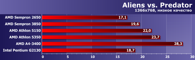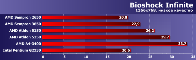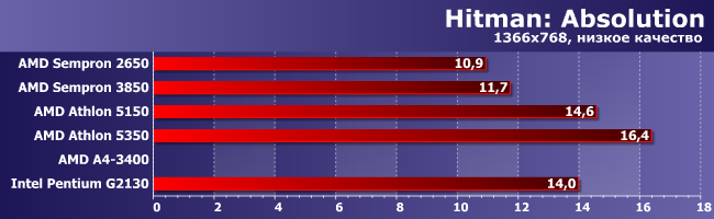 Аналогичный расклад, но тут уже А4-3400 чтобы играть достаточно, а вот Athlon 5350 — лишь почти достаточно; прочие еще хуже.